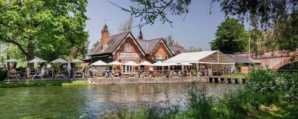 With breathtaking views over the world famous river Test and large trout slurping up flies right beside your picnic table, this riverside Fullerβs pub is a must-do for foodie fly fisherfolk exploring the Hampshire chalk streams. In the high season, the gunsmoke of Mayflies drifting across the weir pool is almost an everyday occurrence, and if the ducks and swans donβt keep you entertained then even as a devoted fly angler, it is impossible to resist the temptation to throw a triple-cooked chip under the railings and watch on with excitement as an enormous brown trout engulfs it without a second glance. Welcome to the Mayfly!