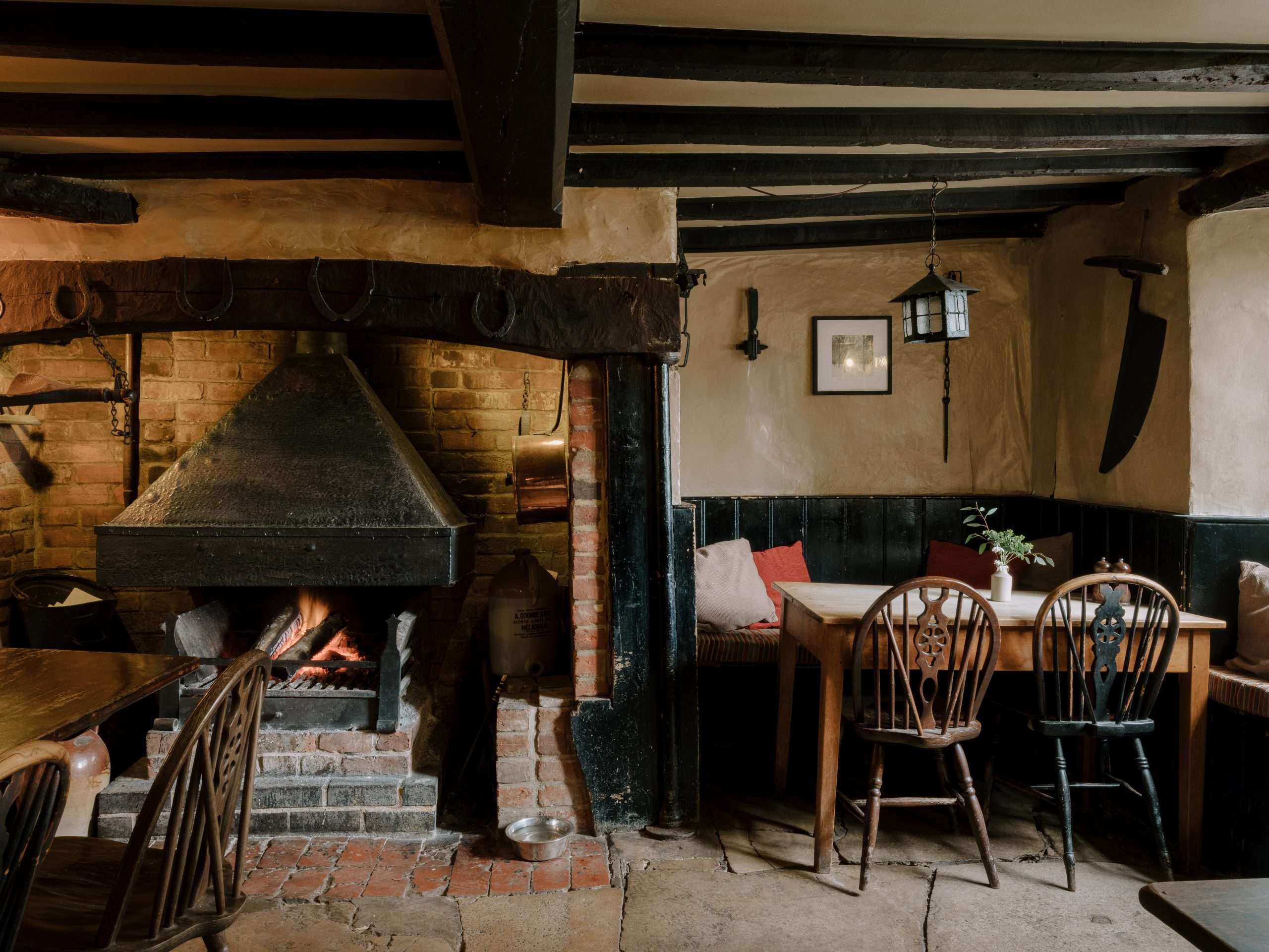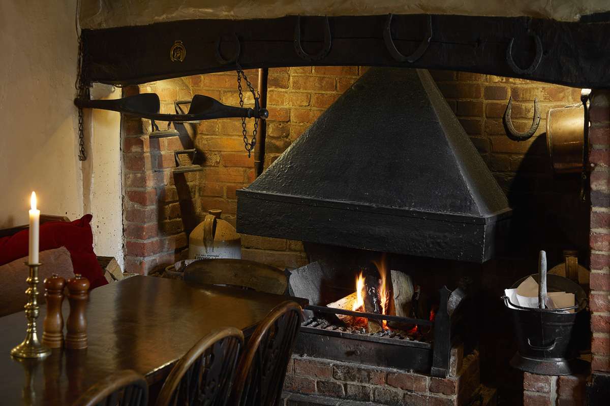 Inside, the Compasses has the comforting patina of a pub that has found no need to reinvent the wheel. Flag stone floors, open fires, oak settles and candlelit corners give it the feel of a storybook inn. A few subtle touches bring it to life — soft lighting and well-chosen textiles sit at ease alongside its medieval bones. In summer, the garden spills out towards the fields; in winter, it contracts around the hearth in a way that makes you want to linger. It’s the sort of place where a day on the river, a pint by the fire and a restful night all feel naturally part of the same rhythm.