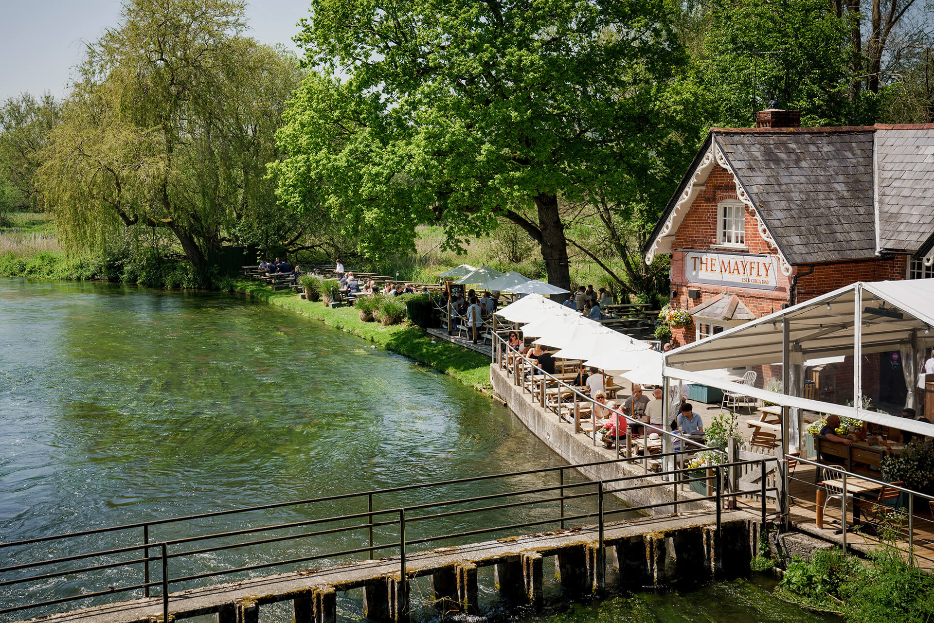 Oh where the bright waters meet! The Mayfly lies beside the main river Test at Fullerton, 10 minutes upstream of  Stockbridge and only 5 minutes south of the A303, the main road that runs east to west joining Hampshire with Wiltshire, Dorset and Devon so if you are travelling down from London, this is a great place for a pit stop.  There are riverside walks in both directions and no matter which way you turn there is highly prized fly fishing around every corner. This location is one of the best of any fly fishing pub around, with front row views over the main river test and an adjacent carrier stream as it riffles off into the distance. The only caveat is the busy road bridge, though it is all but a distant hum from the beer garden and quickly drowned out by the tumbling weir pool. This truly is a unique spot!