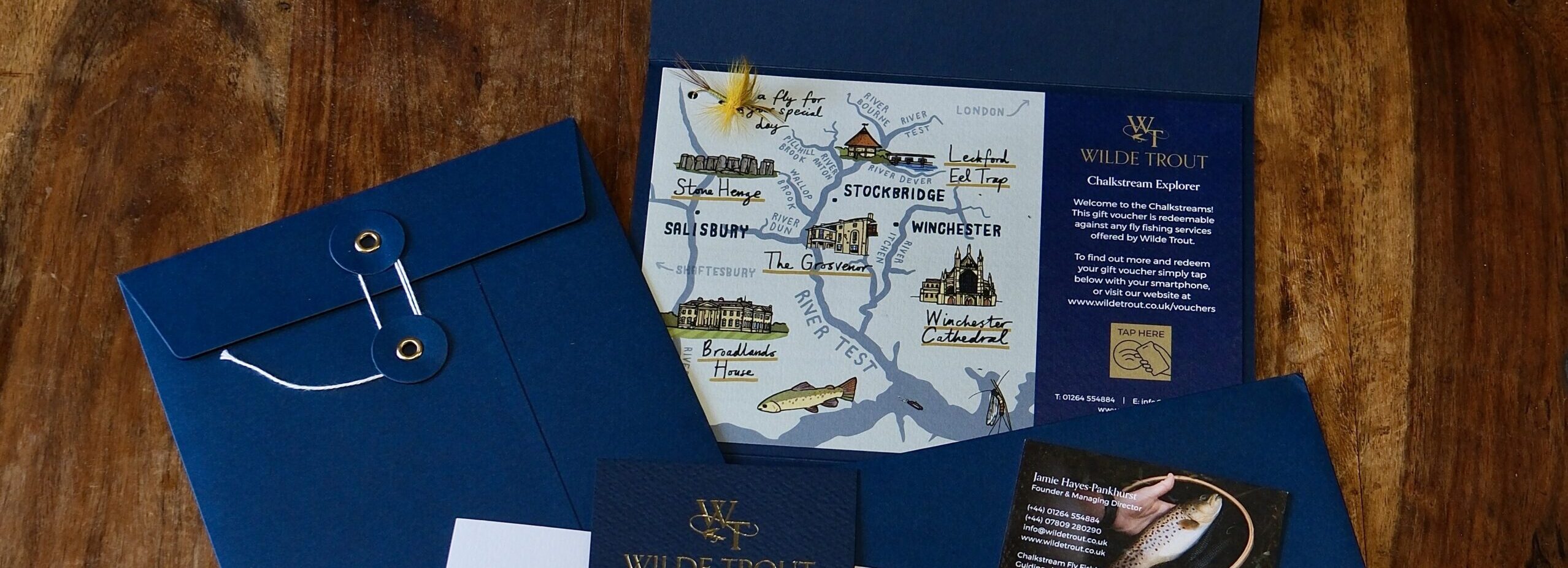 The voucher will arrive by first class Royal Mail, in a stiff card envelope. Inside you will find a much smarter, string and washer envelope, containing the voucher wallet itself with a bespoke illustration of the famous River Test in Hampshire, and all the details required in order to redeem it, plus a fishing fly for the special day! We even throw in our plain white comp card so that you can write a message to the lucky recipient if you wish.
